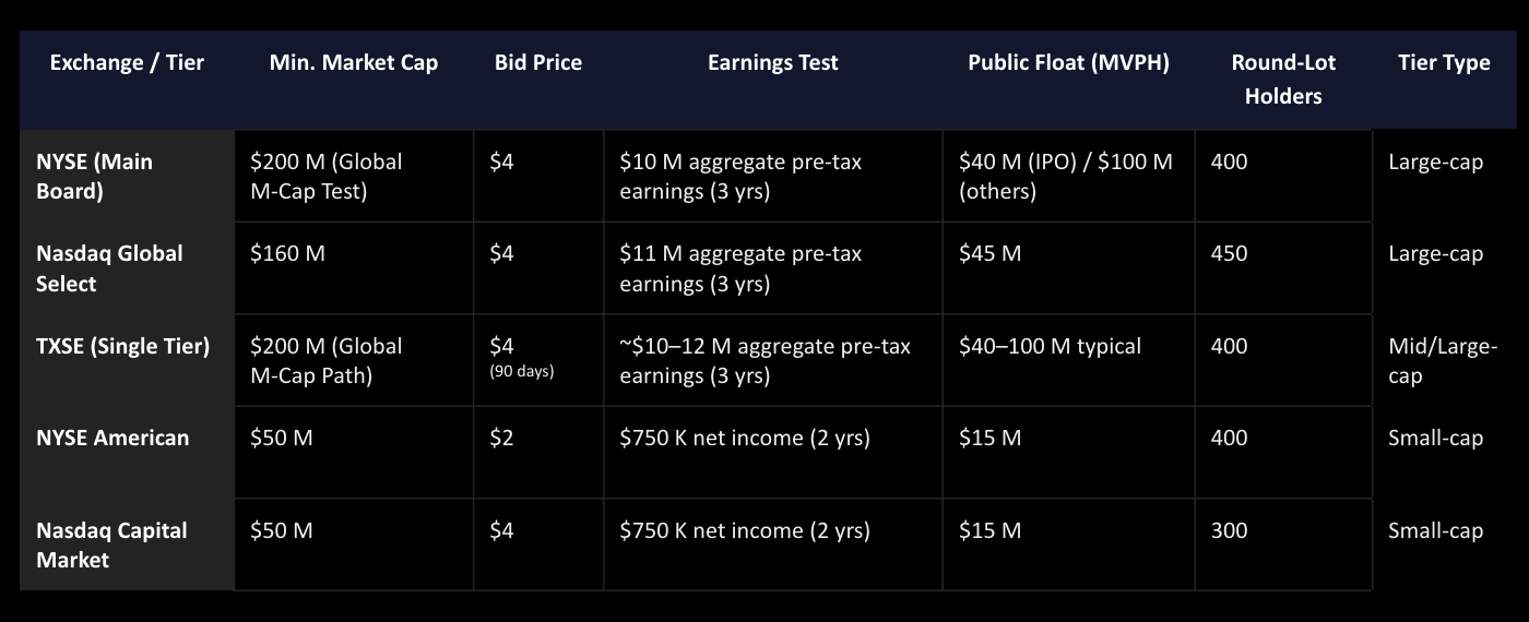 TXSE’s listing framework reflects this philosophy. Under its Global Market Capitalization pathway, a company must maintain a global market capitalization of at least $200 million and a minimum bid price of $4, sustained for 90 consecutive trading days for already-listed issuers. The alternative Earnings pathway requires aggregate pre-tax earnings over the past three fiscal years, as defined under Rule 16.310(c) of its listing standards. Issuers must also have at least 1.1 million publicly held shares, a Market Value of Publicly Held Shares (MVPH) of $40 million in most cases (or $100 million for IPOs), and a minimum of 400 round-lot holders.